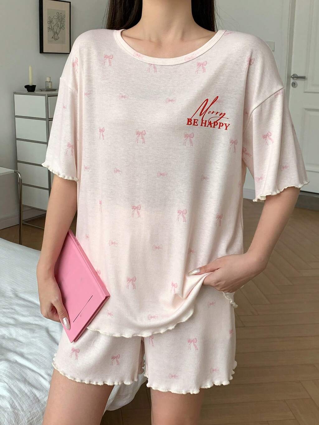 2 pezzi Set pigiama estivo da donna con pantaloncini dritti e maniche corte, con stampa a fiocco e stampa in inglese