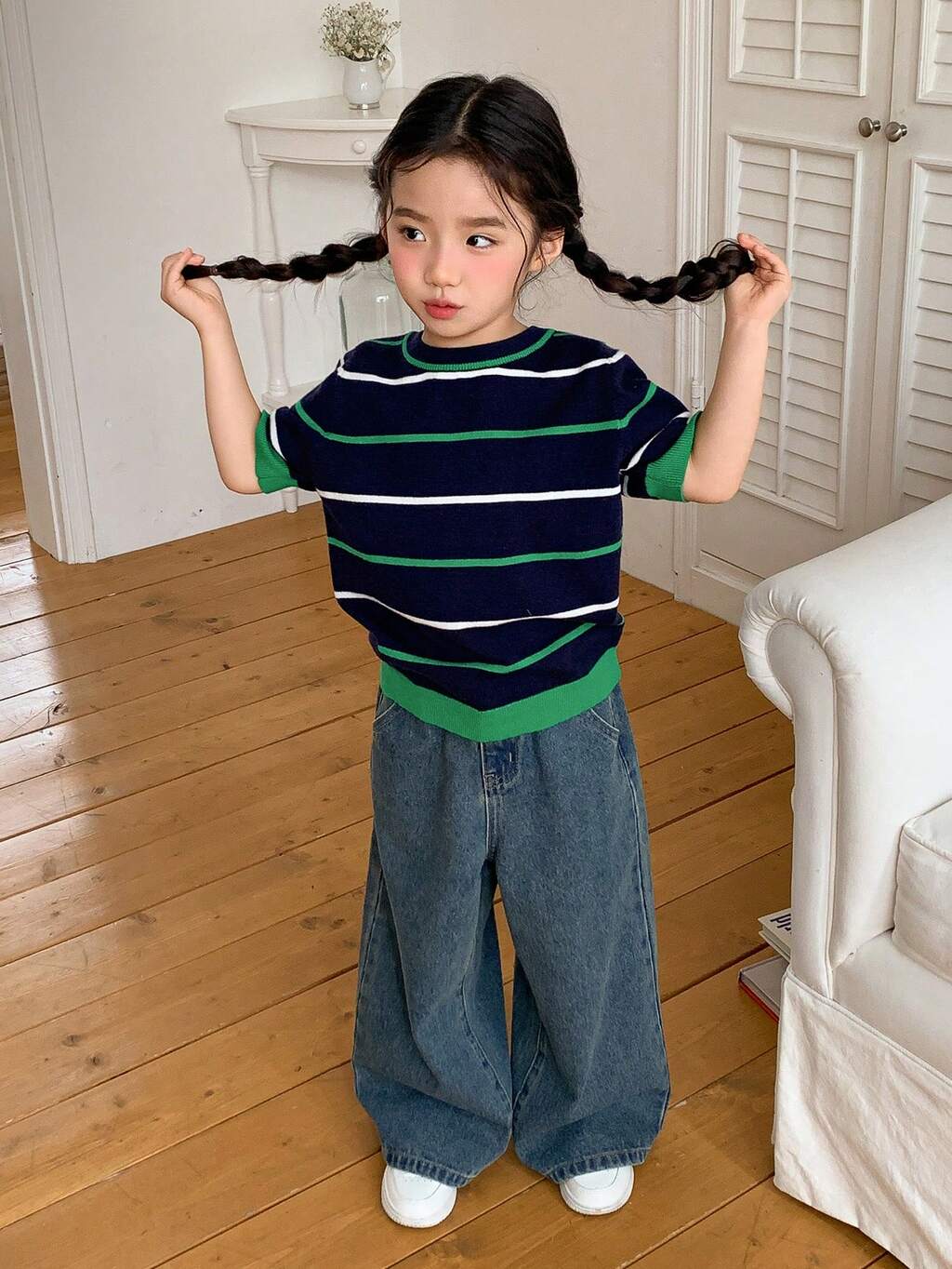 Young Girl Colorblock Striped Short Sleeve Sweater, Casual For Spring/Autumn