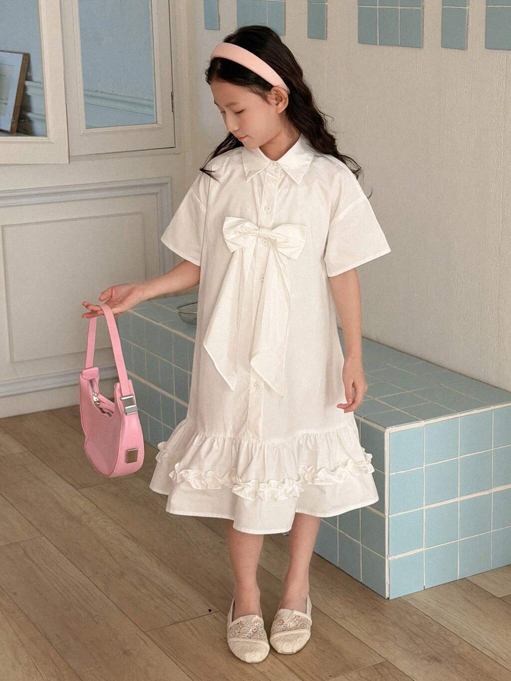 Tween Girls' Solid Color Drop Shoulder Short Sleeve Casual Dress With Bow Decor And Ruffle Hem Spring Summer