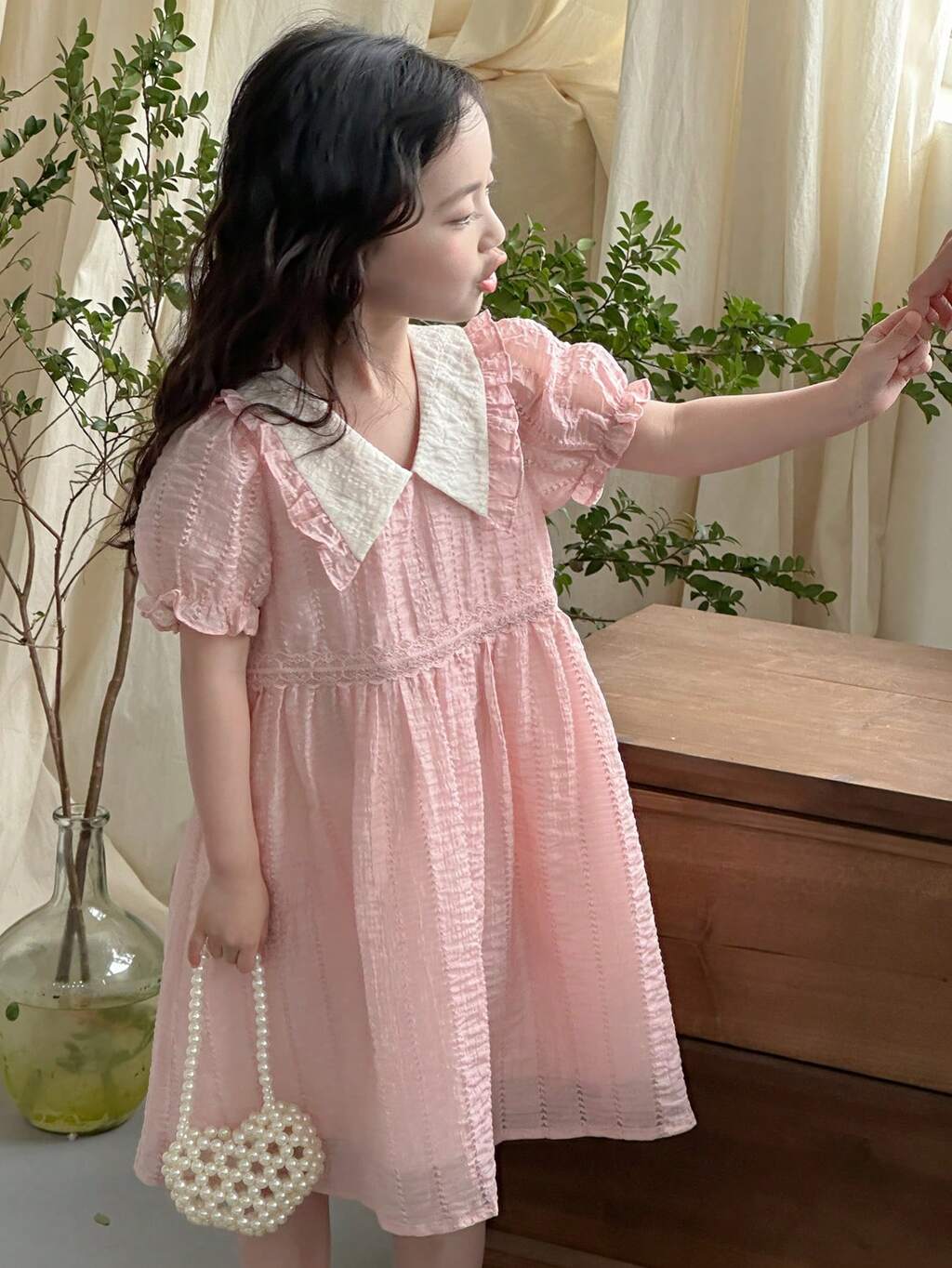 Young Girls' Summer Casual Contrast Color Collar Puff Sleeve Dress
