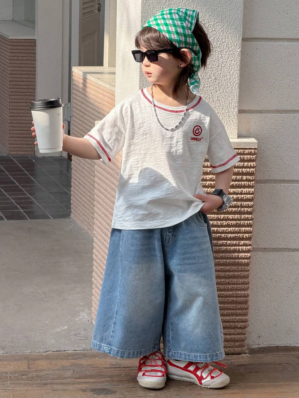 Young Boy Round Neck Letter & Smiling Face Print Casual Everyday T-Shirt Spring Summer