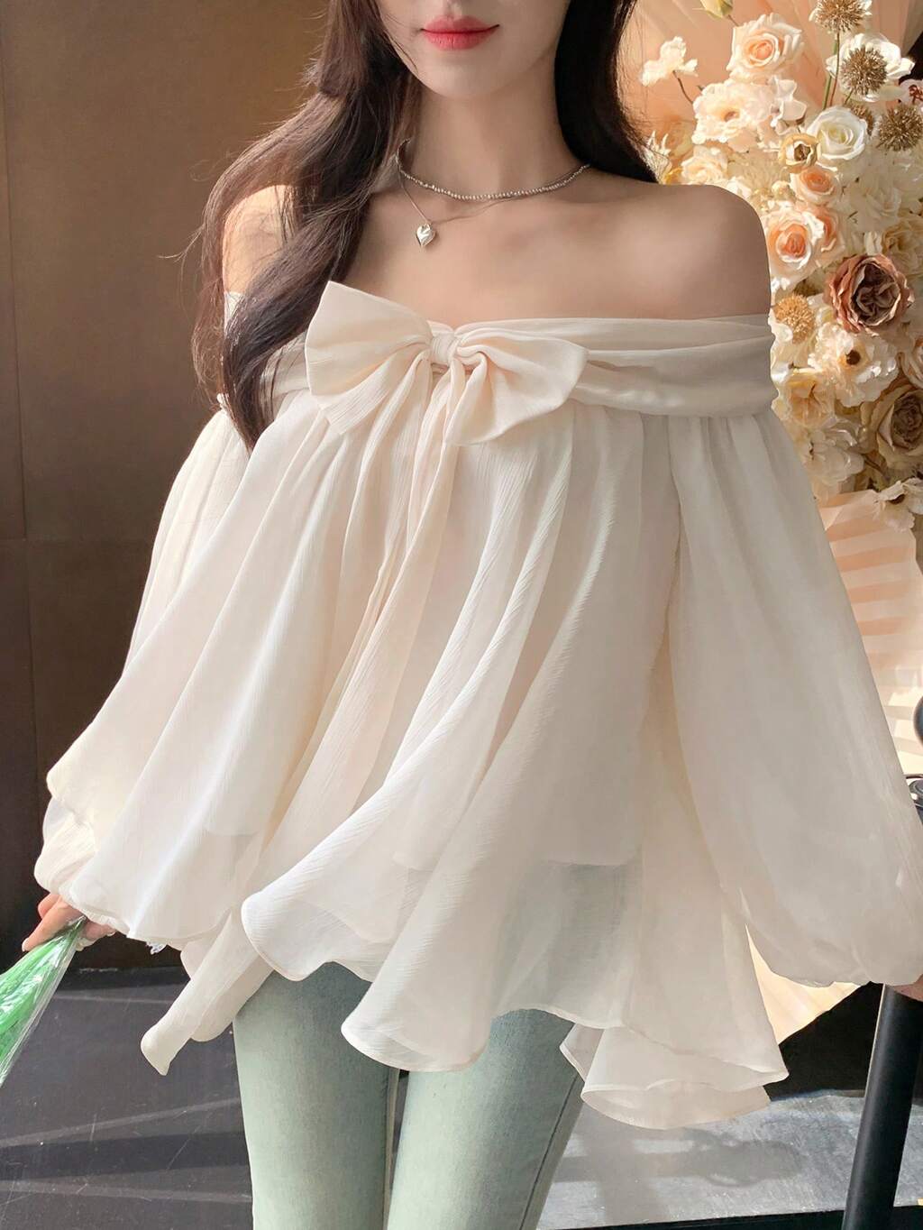 Camisa Longa de Manga Flare com Laço, Decote Ombro Caído, Fit Solto, em Tecido de Chiffon, Adequado para Férias de Verão, Parte Superior Ombro Caído