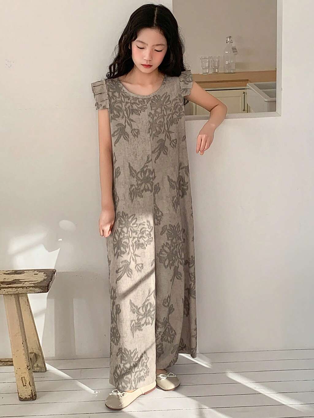 Tween Girl Floral Print Round Neck Cap Sleeve Wide Leg Jumpsuit