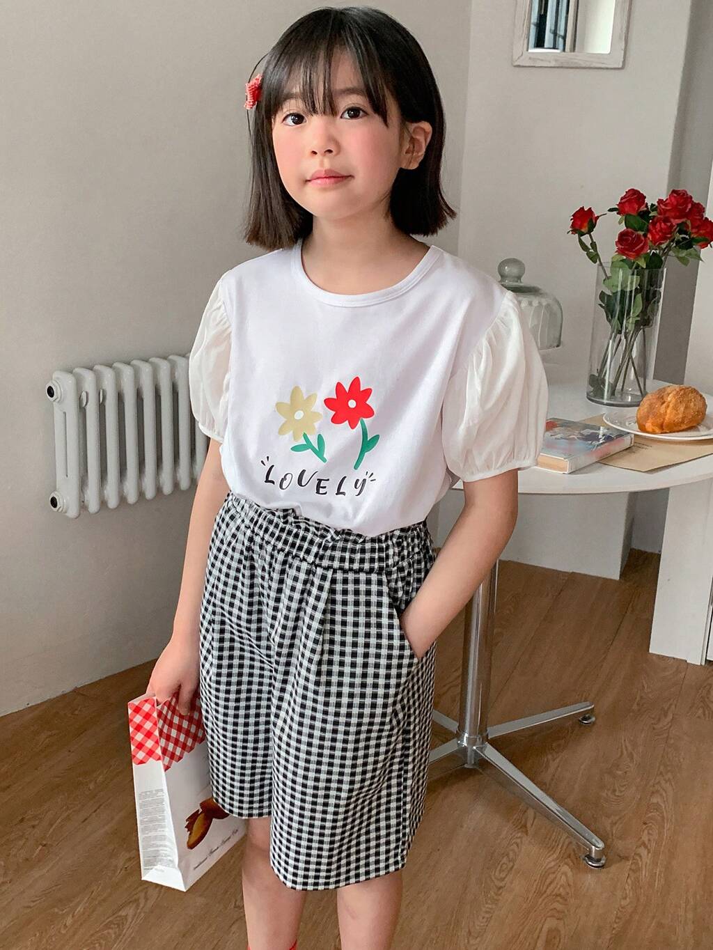 Tween Girl Floral Print Knit Top & Woven Plaid Shorts Fashion Set, Summer, Back To School Clothes
