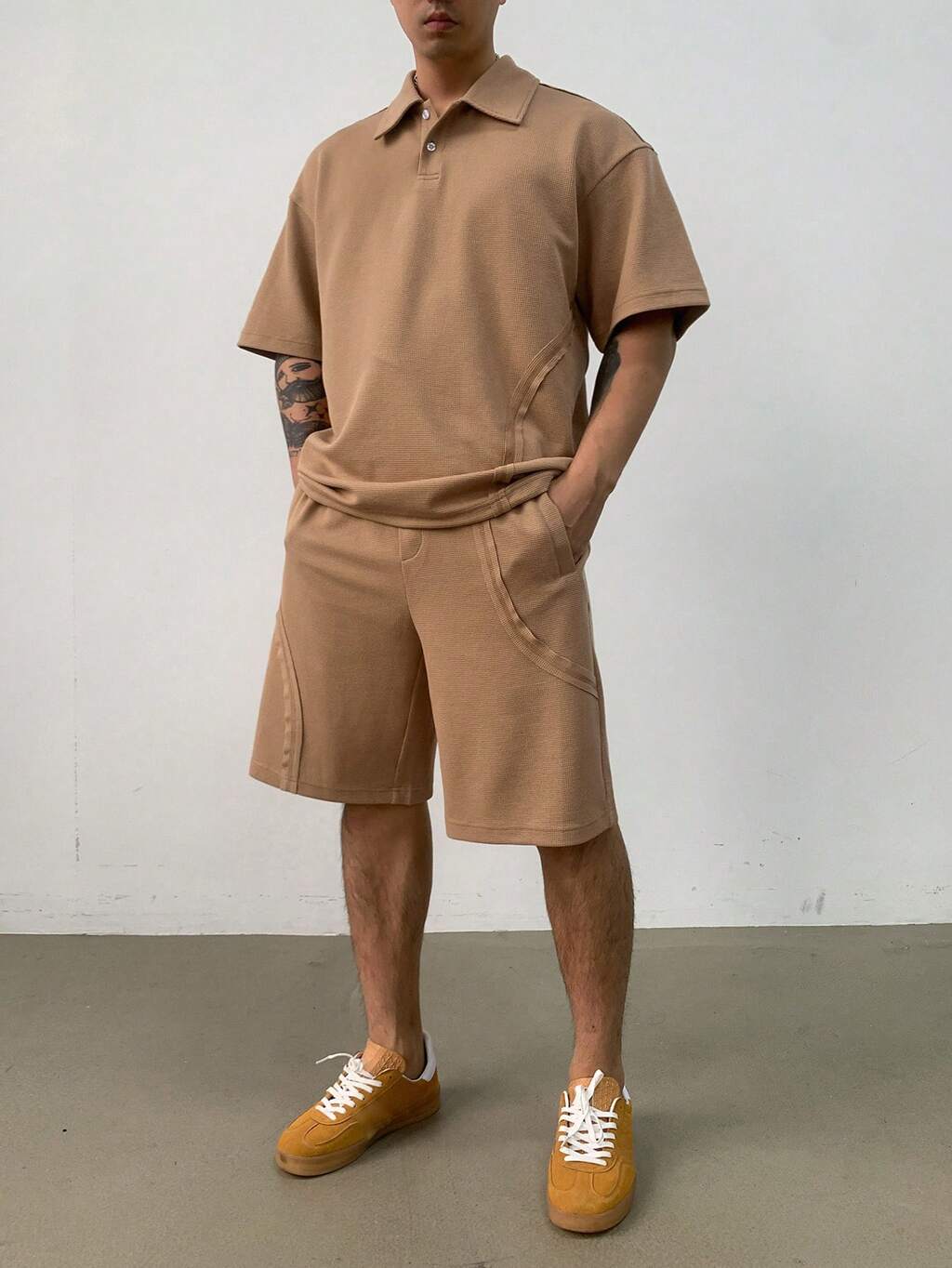 Summer Solid Color Textured Fabric Short Sleeve Polo Shirt And Shorts Set For Men