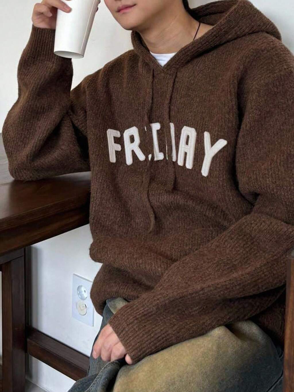 Men's Brown Applique Embroidery Hoodie Sweater, Autumn