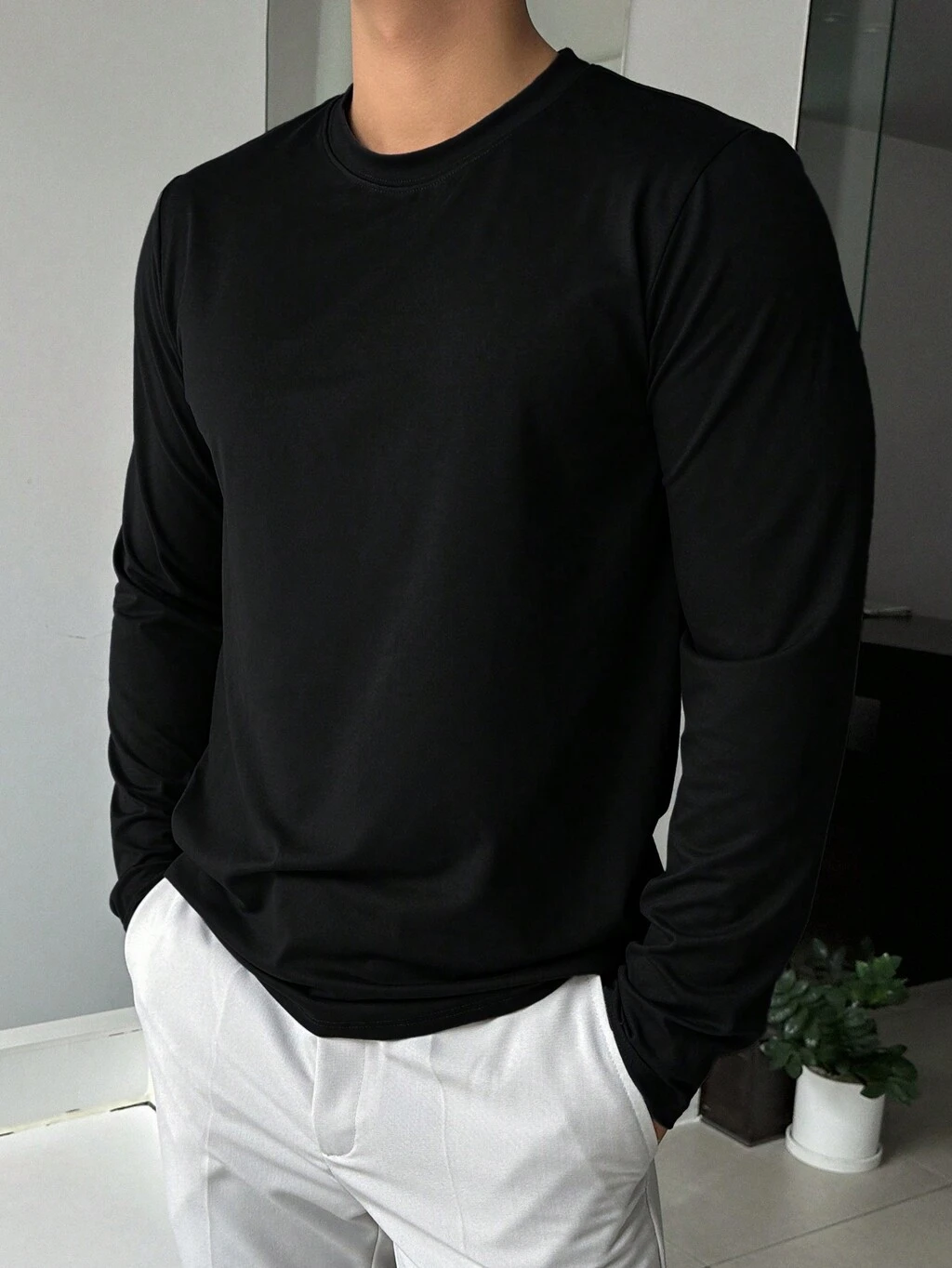 Men's Solid Color Black Round Neck Long Sleeve Casual T-Shirt, Spring & Summer,Fall