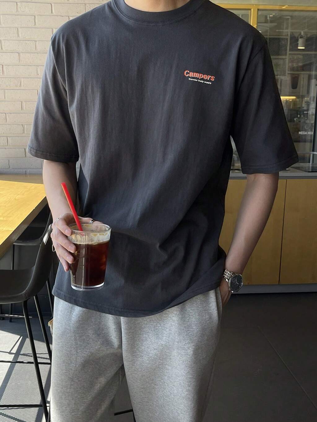 Men's Letter Print Blue Round Neck T-Shirt, Summer