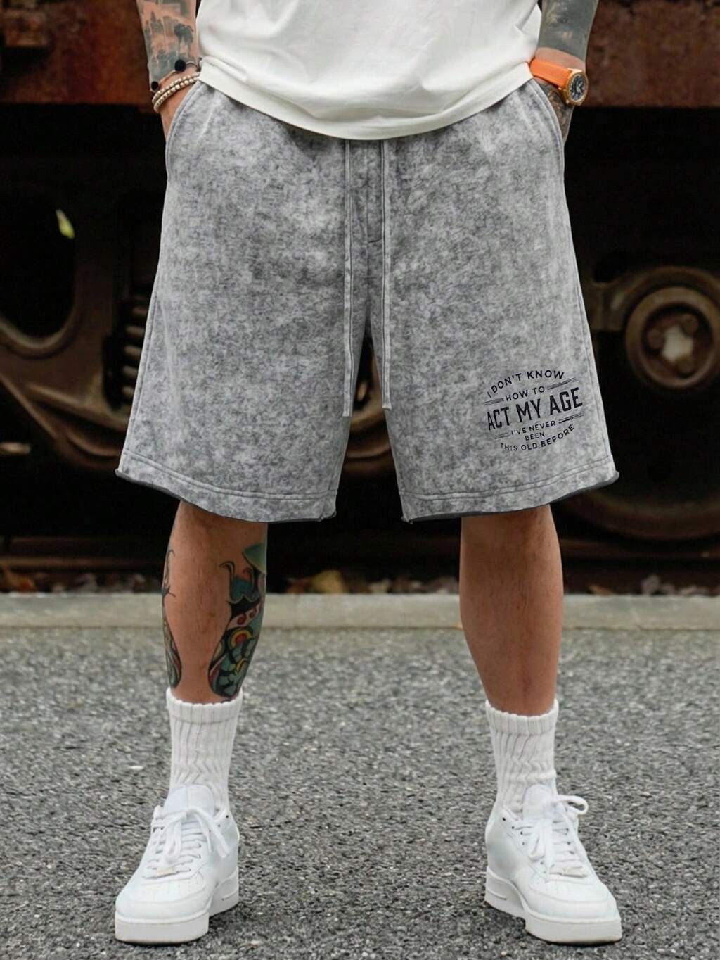 Men's Letter Print Washed Gray Elastic Waist Shorts, Summer