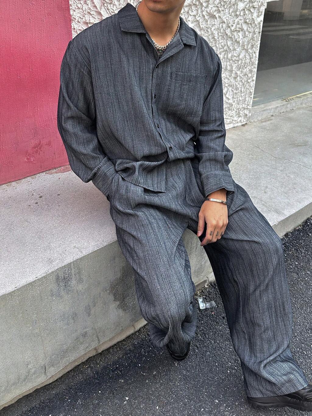 1set Men's Solid Dark Gray Shirt Set, Summer
