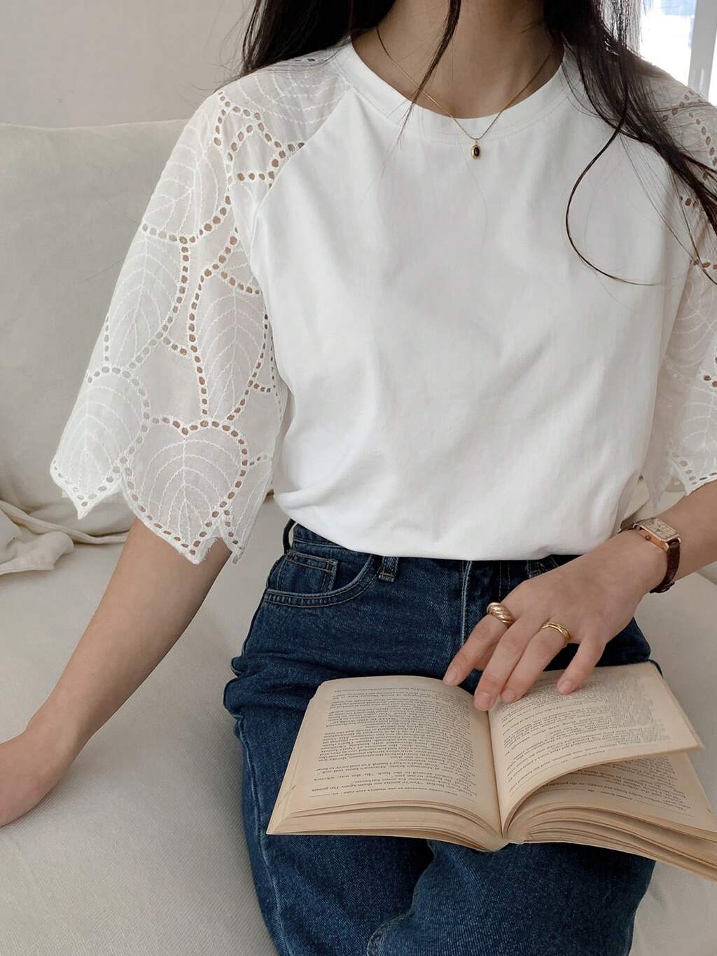 Women's Solid Color Lace Patchwork Short Sleeve T-Shirt, Casual And Fashionable For Daily Wear