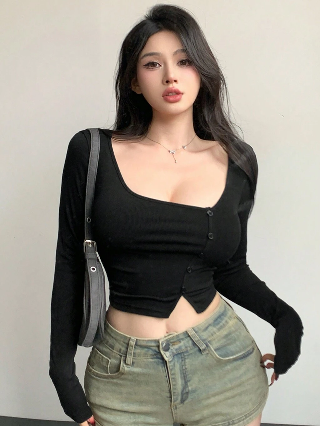 Ladies' Solid Color Slim Fit Crop Long Sleeve T-Shirt With Side Slit,Fall Clothes Going Out Tops Women