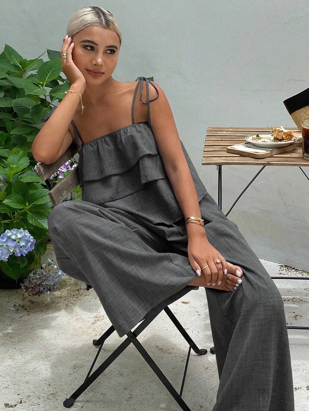 2 pièces/Set Débardeur court à volants mode femme et pantalon large taille haute avec lien à la taille, tenue d'été décontractée pour vacances femme