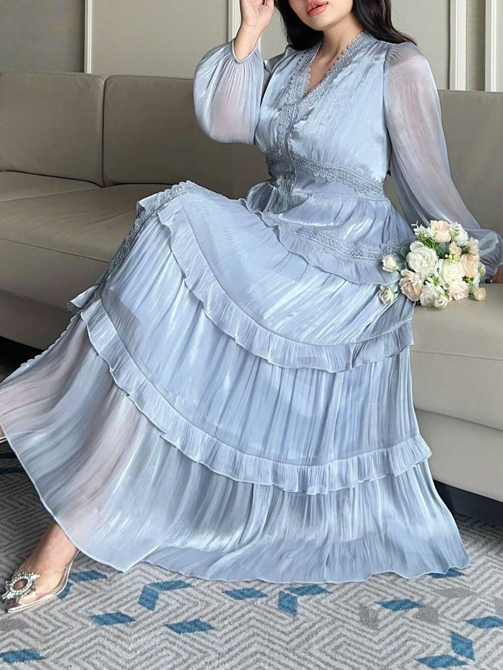 Dazy Plus V-Neck Lace Patchwork Frill Trim Layered Chiffon Waist Cinched Elegant Long Lantern Sleeve Plus Size Women Dress, Spring/Summer Maxi Dress Sundress