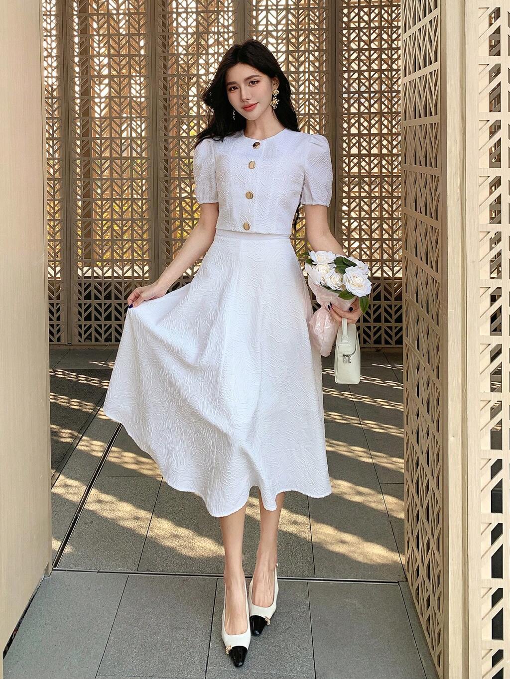 White Cotton Round Neck Short Sleeve Waist Cinched Midi Dress For Women, Suitable For Easter Party, Summer Holiday