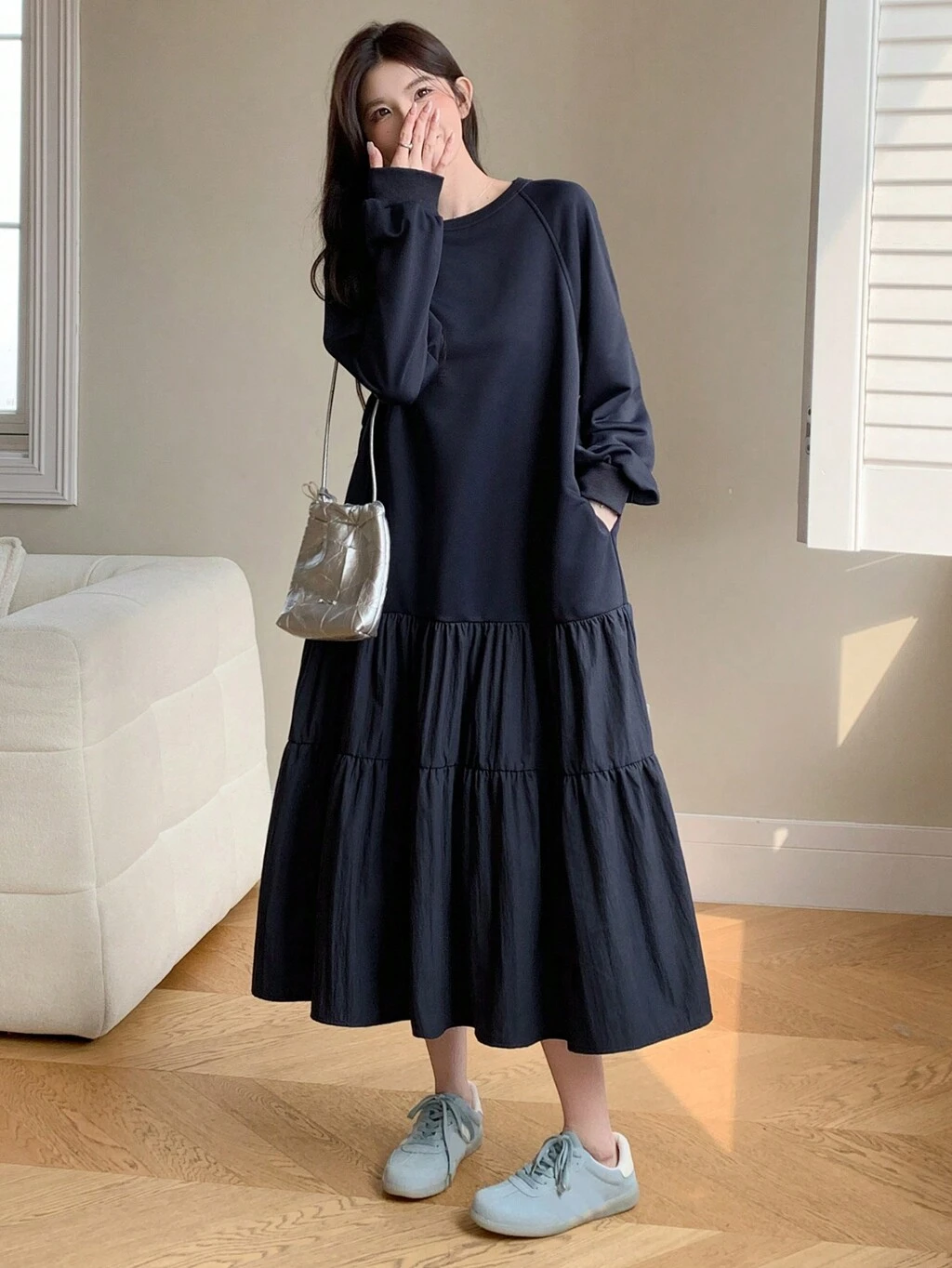 Women Solid Color Round Neck Long Sleeve Ruched Casual Autumn/Winter Hooded Midi Dress,Back To School Clothes