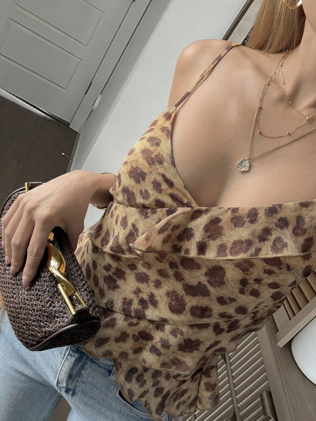 Animal Print V-Neck Ruffle Hem Fitted Camisole Top, Suitable For Spring & Summer
