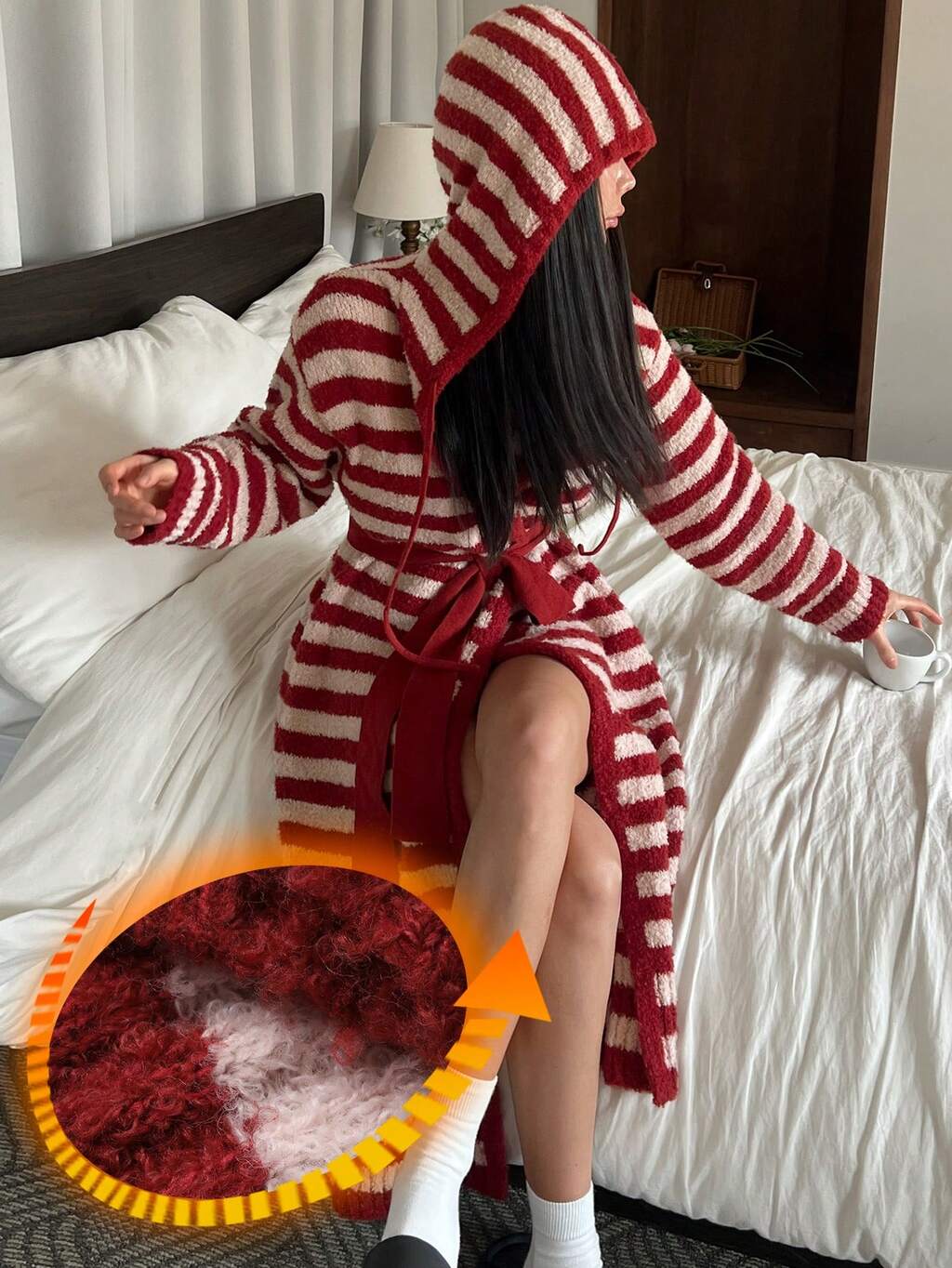 Women's Long Striped Jacquard Hooded Bathrobe, Autumn/Winter
