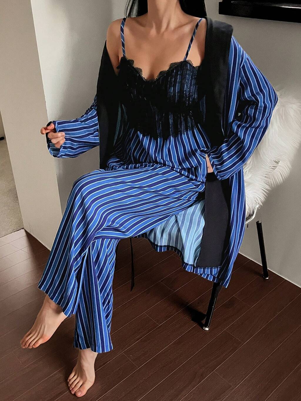 3pcs/Set Striped & Lace Patchwork Robe, Camisole, And Pants Women Sleepwear Set