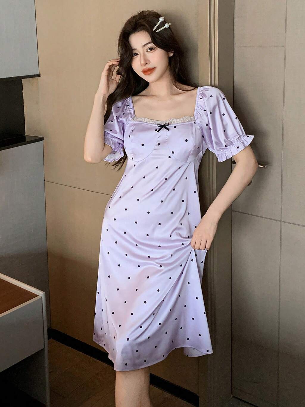 Women's Lace Patchwork Polka Dot Full Print Ruched Puff Sleeve Nightgown Pajama