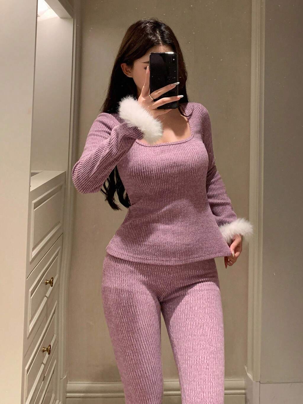 Women's Brushed Knit Fuzzy Fluffy Cuff Trim Top & Pants Fitted Pajama Clothes Set, Autumn/Winter, Cozy