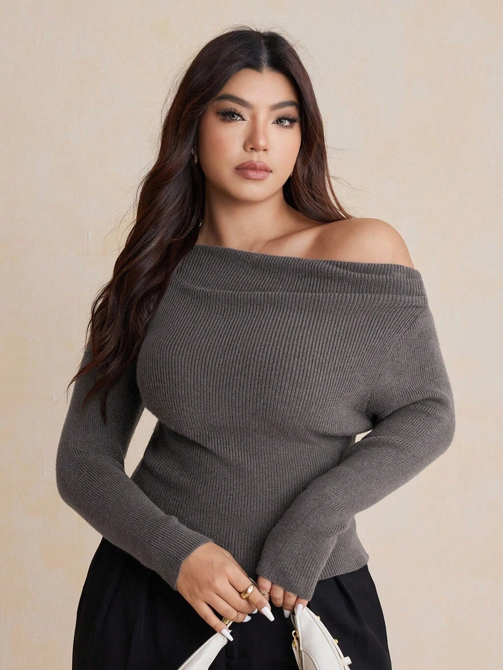 Dazy Plus Plus Size Women Elegant Solid Color Off-Shoulder Pullover Sweater, Suitable For Party, Autumn