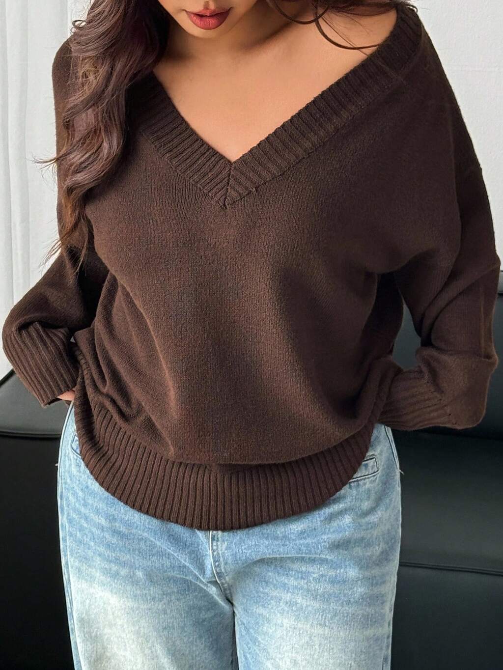 Dazy Plus Plus Size Women V-Neck Loose Thick Pullover Sweater, Casual For Autumn/Winter