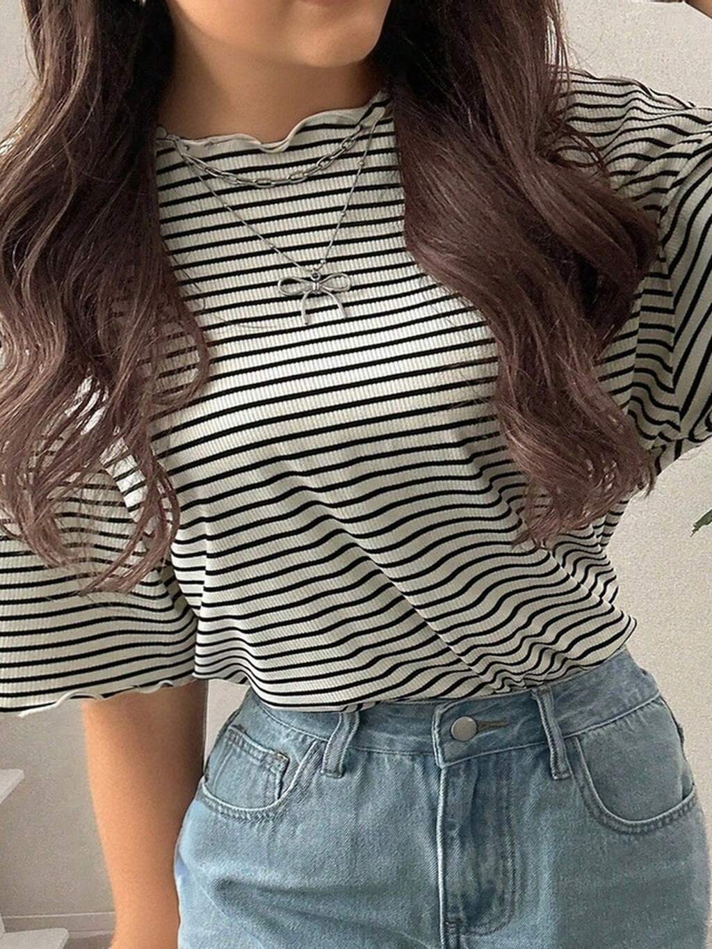 Dazy Plus Oversized Striped Short Sleeve Black And White Summer T-Shirt Preppy Tops