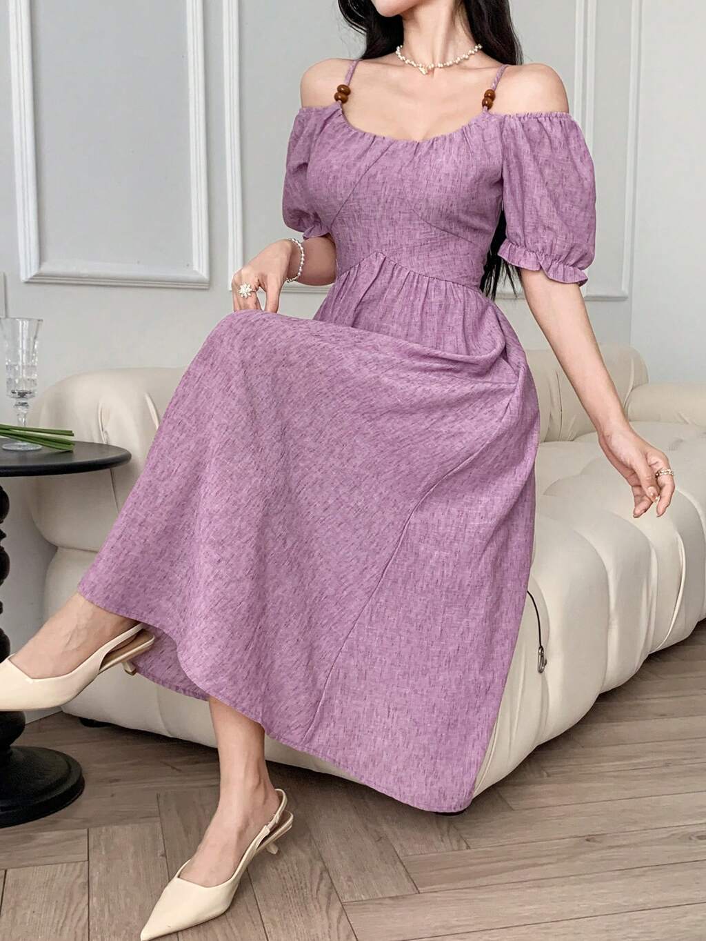 Women's V-Neck Puff Sleeve Hollow Shoulder Waist Cinched Dress, Purple, Casual Women Dress