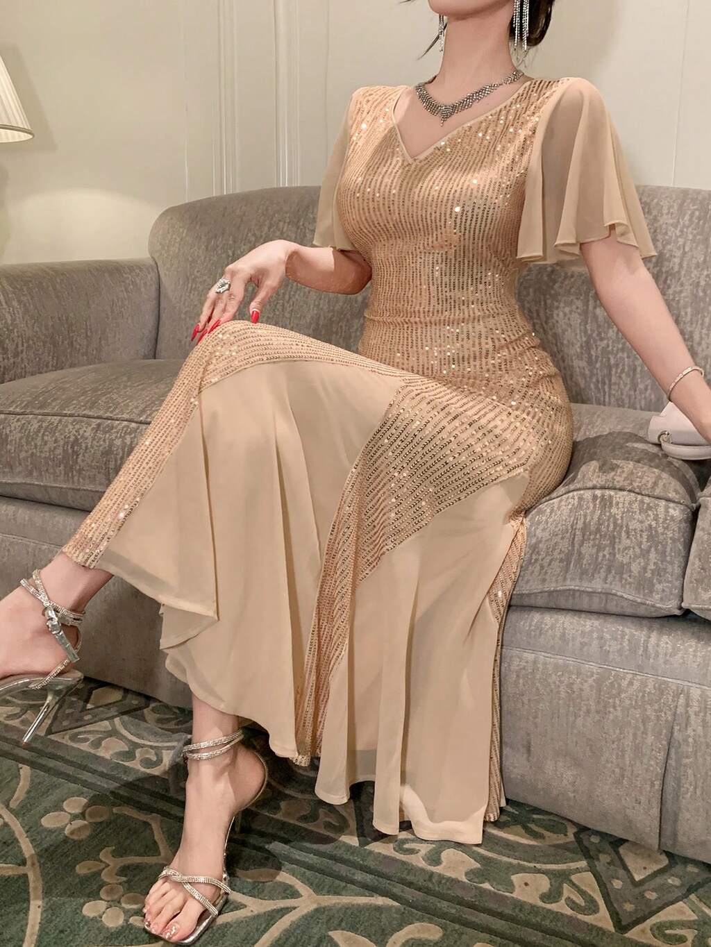 Robe élégante pour femmes avec patchwork de sequins, manches volantées et coupe sirène. Robe d'invitée de mariage d'été étincelante et légère