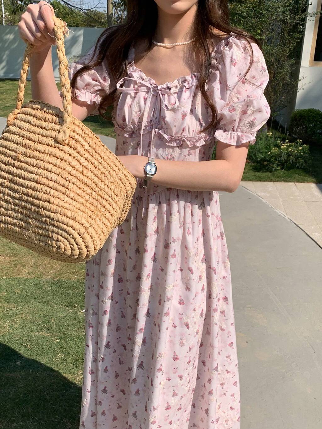 Spring & Summer Ditsy Floral Chiffon Dress, Elegant Waist Cinched Midi Dress, Casual Beach Vacation Style, Suitable For Wedding, Commute Sundress