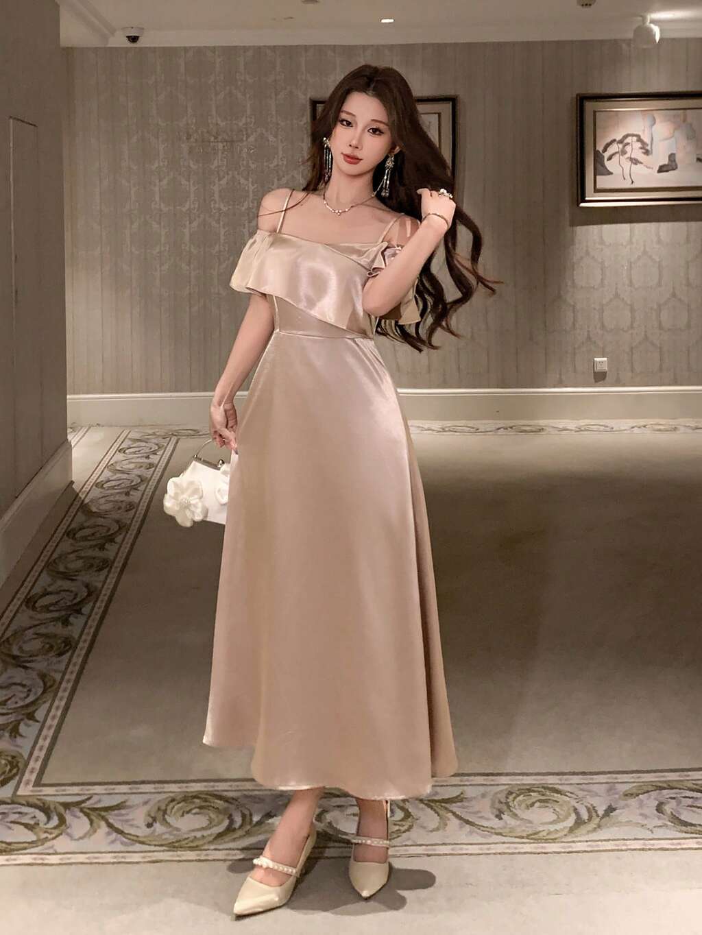 Women's Elegant Solid Color Ruffle Off-Shoulder Mid-Length Dress, Summer,Wedding Guest Dress Women Sundress