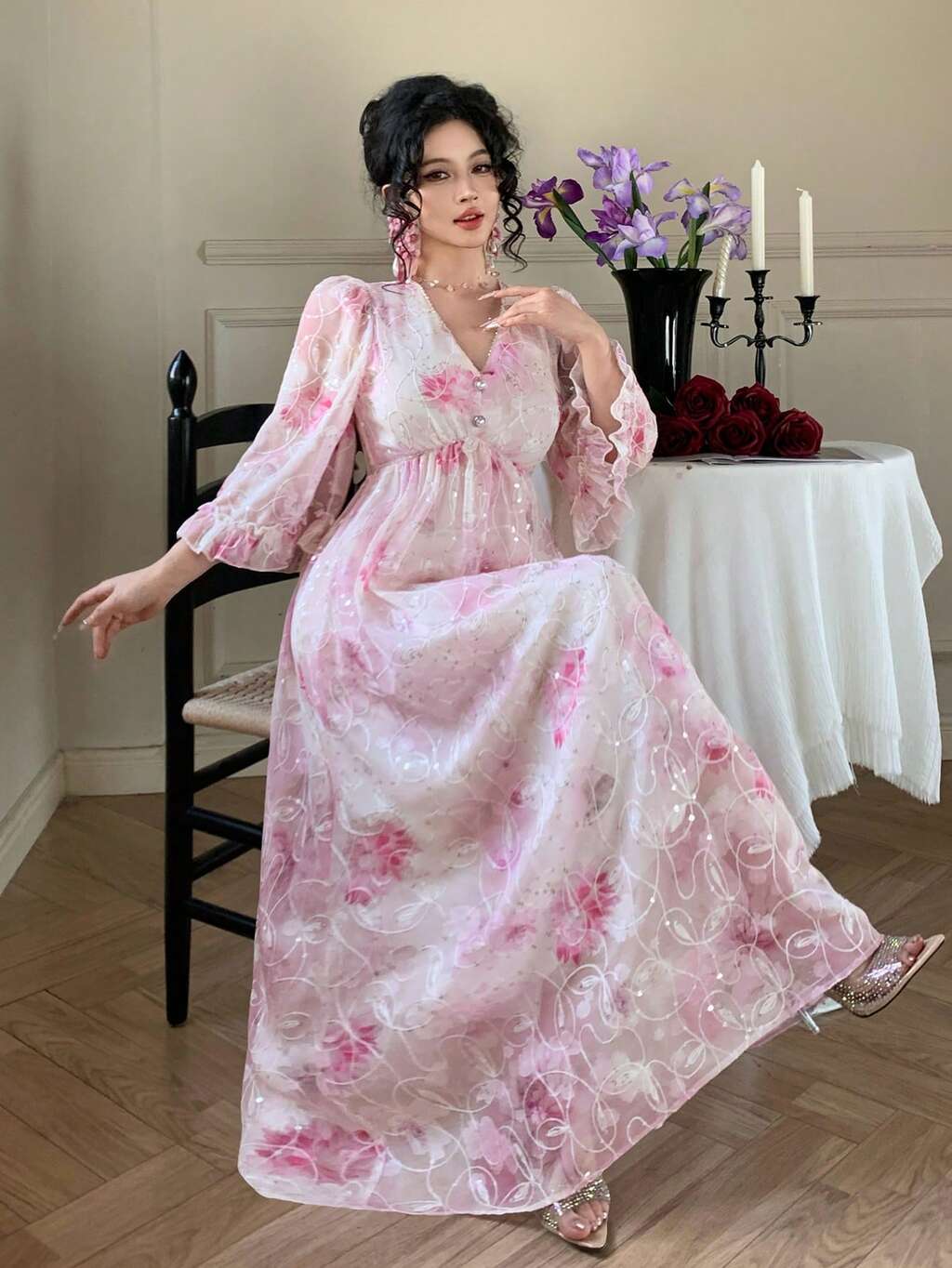 Floral Print Chiffon V-Neck Mid-Length Ruffle Trim Dress For Women,Fall Clothes Long Sleeve Dress Maxi Dress