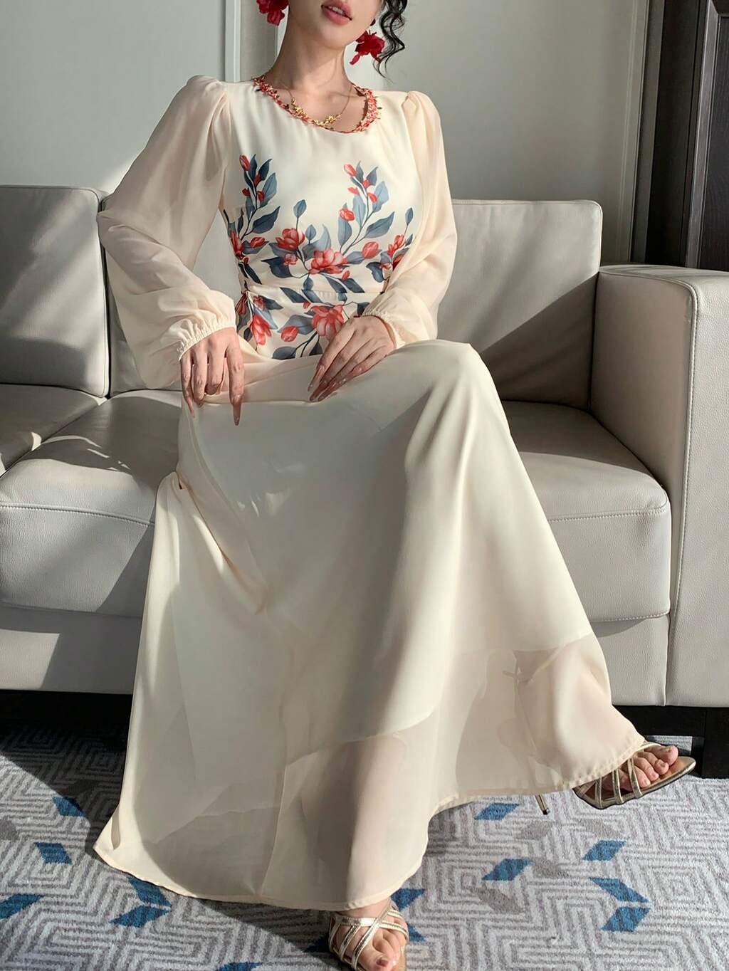 Women's Ditsy Floral Mid-Length Dress, Spring/Fall, Valentine's Day Long Sleeve Dress Maxi Dress