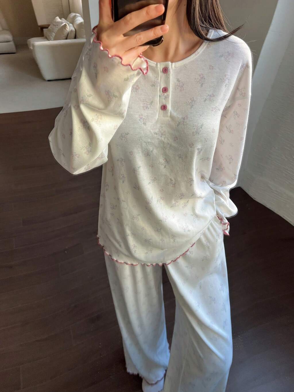 Floral Print Brushed Knit Fitted Women Pajama Set, Autumn/Winter Fall Clothes