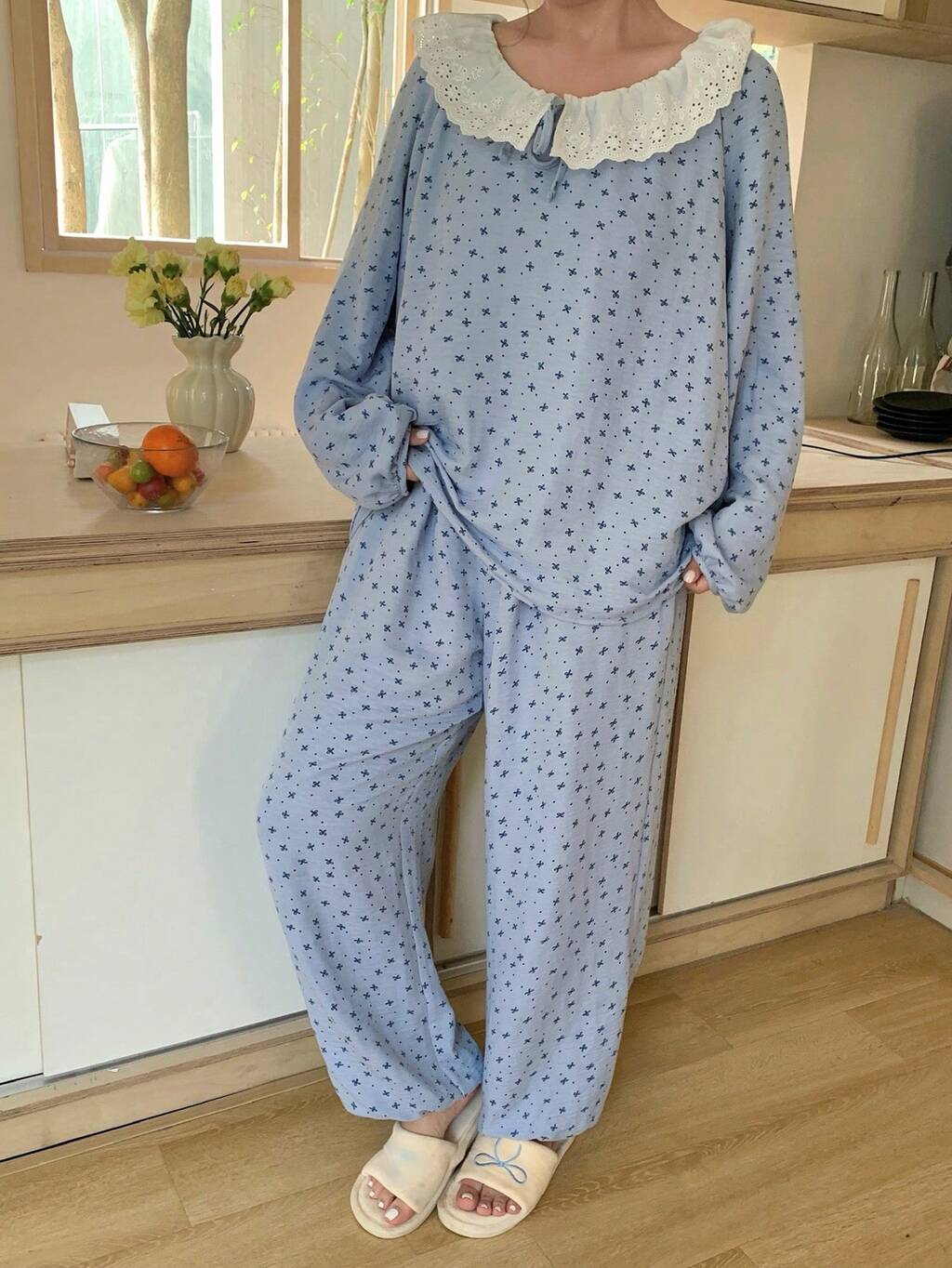 Comfortable Knit Lace Patchwork Collar Women Lounge Set Fall Winter Clothes