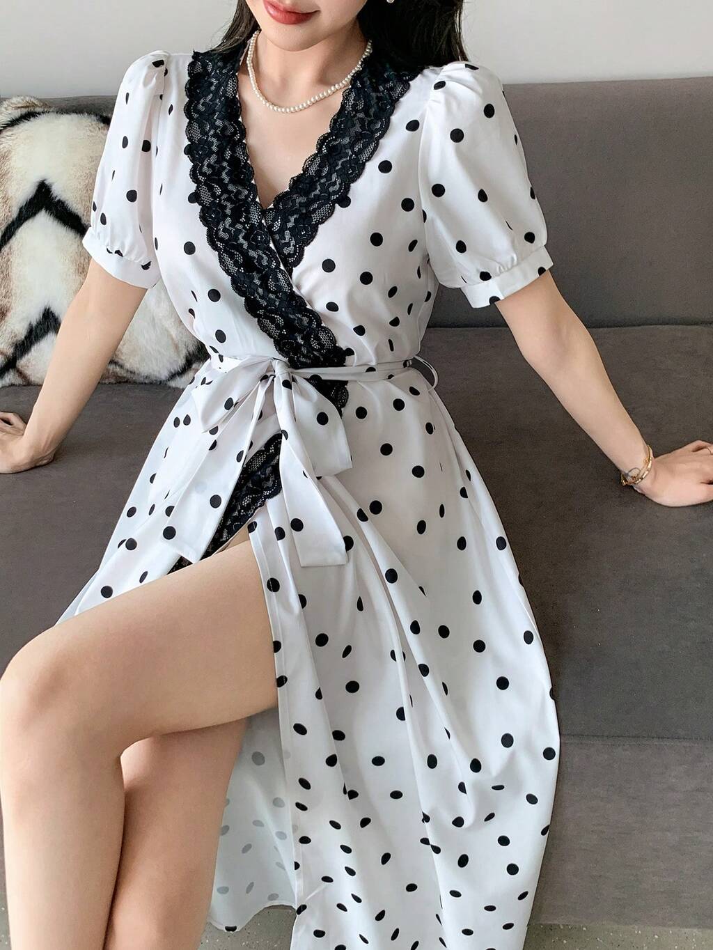 Polka Dot Print Contrast Color Lace Patchwork Puff Sleeve Long Women Robe