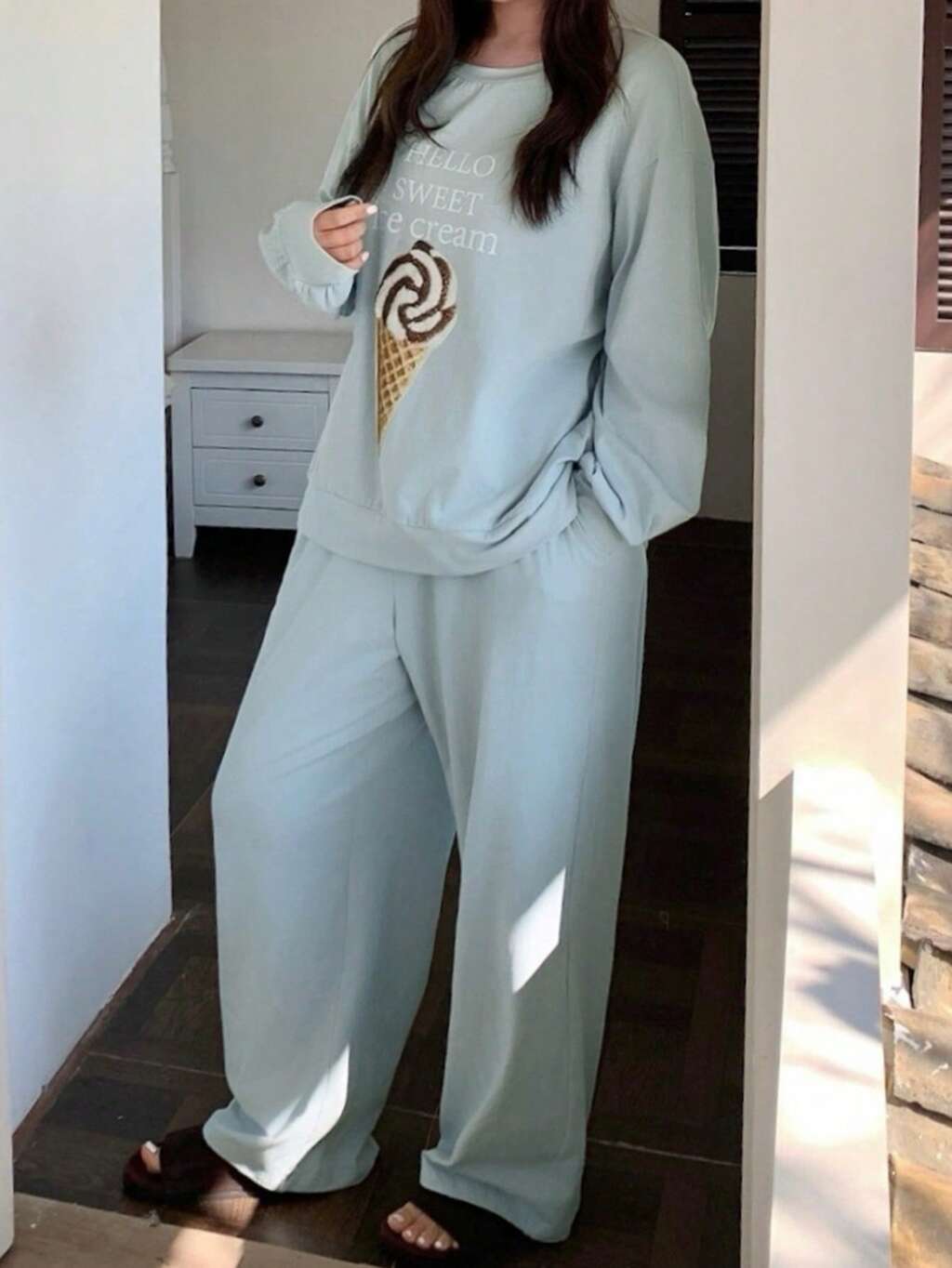 2pcs Women Cartoon Bear Pattern Loose Long Sleeve T-Shirt And Pants Pajama Set