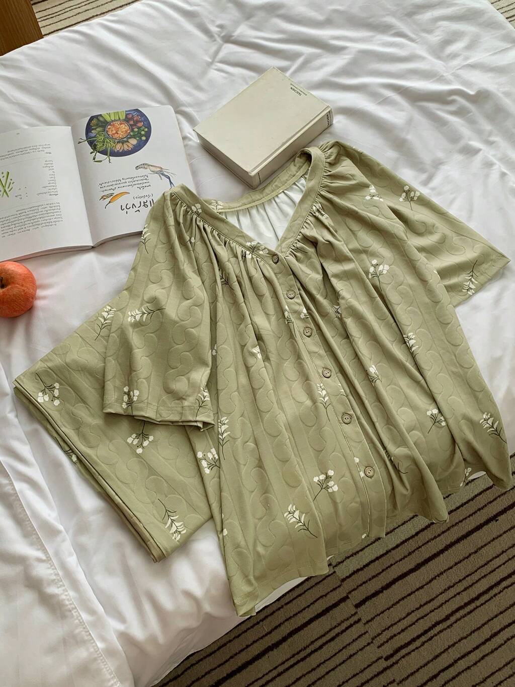 Women's Floral All-Over Print Pleated Short Sleeve Top And Pants Pajama Set