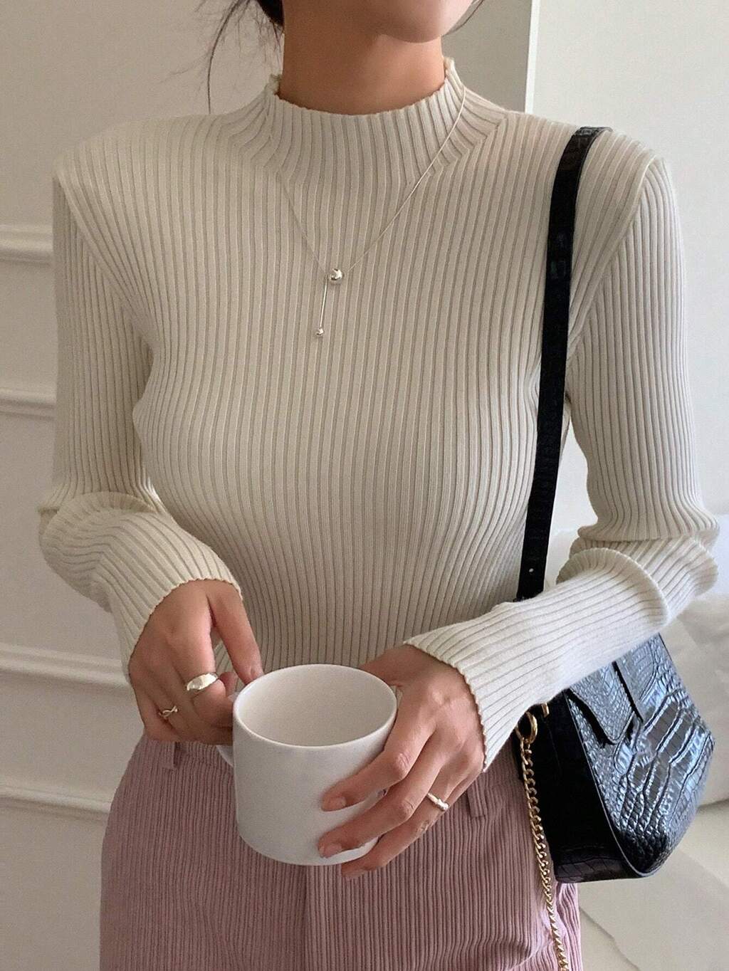 Mock Neck Ribbed Knit Sweater,Long Sleeve Tops,Fall Clothes