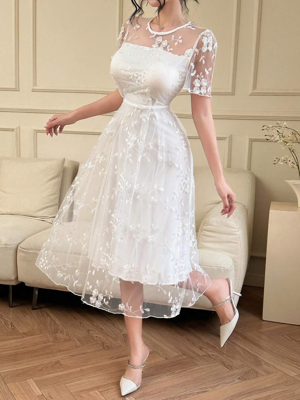 Round Neck Short Sleeve Floral Lace Mid-Length Dress For Women, Suitable For Holiday, Date Night Elegant Sundress