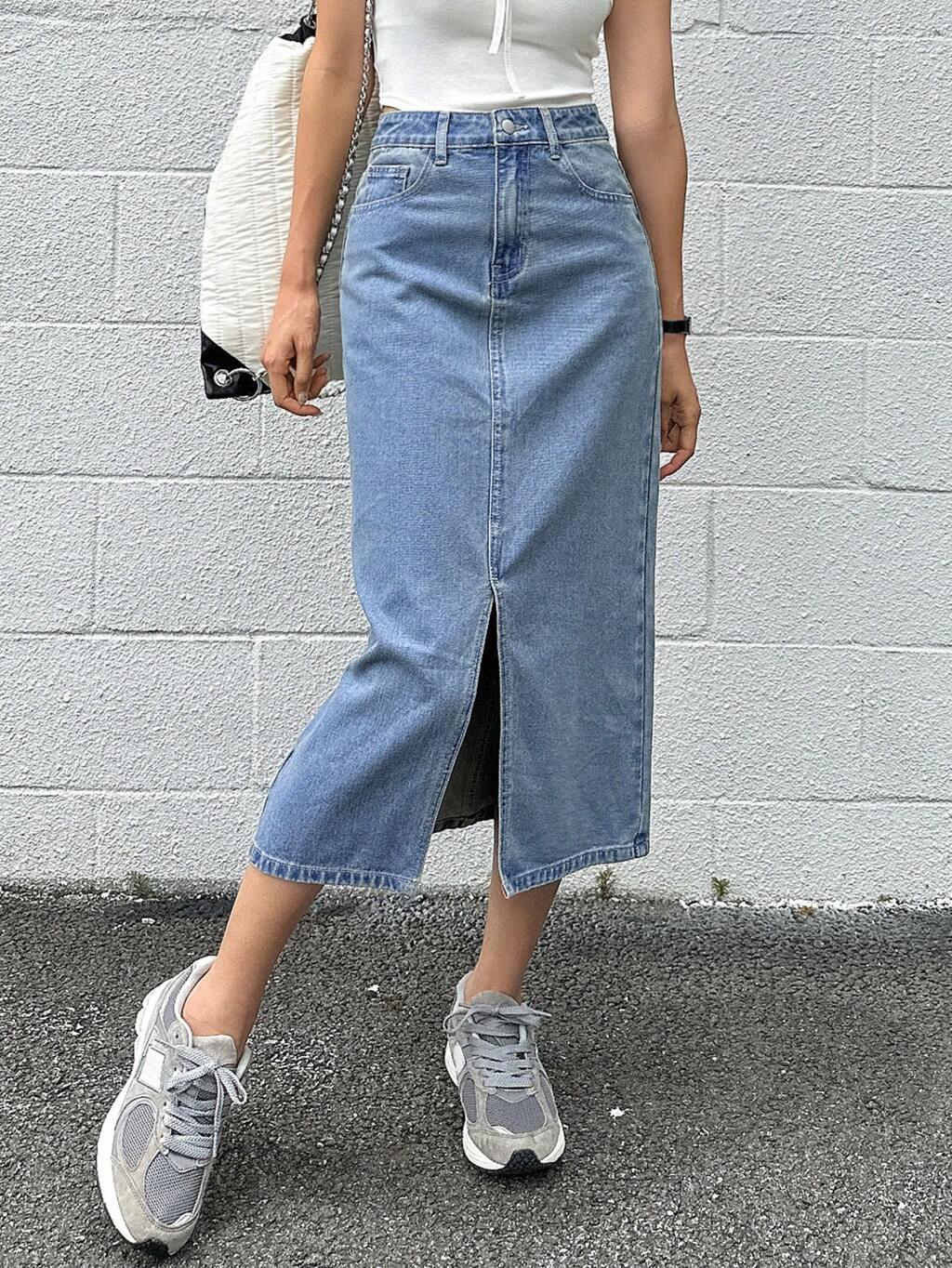 Solid Split Thigh Denim Skirt Jeans Skirt
