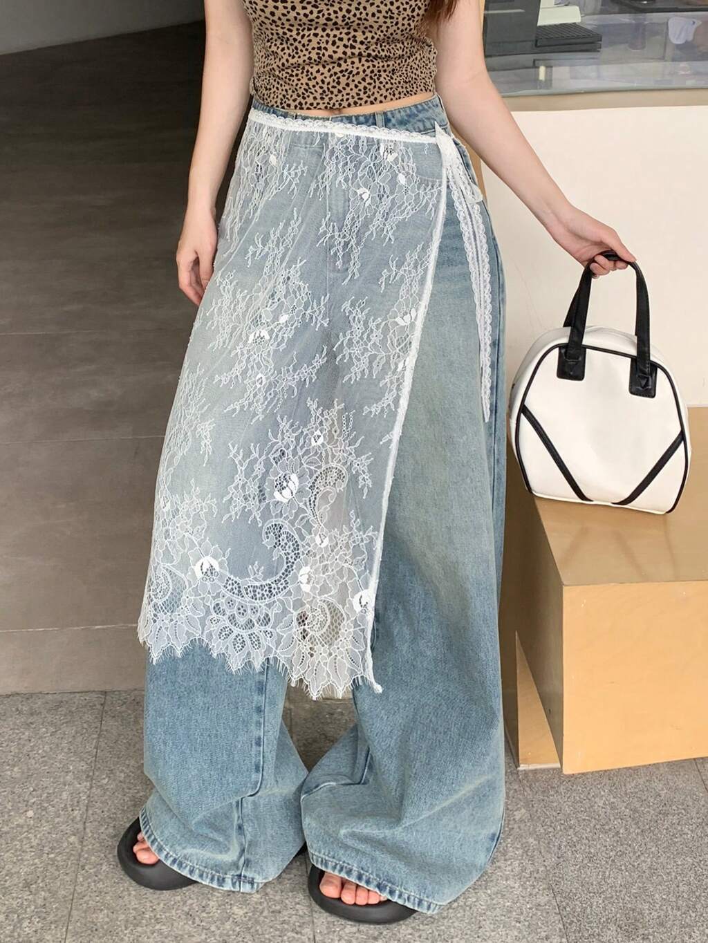 Distressed Wash Patchwork Wide Leg Jeans For Women,Baggy Jeans
