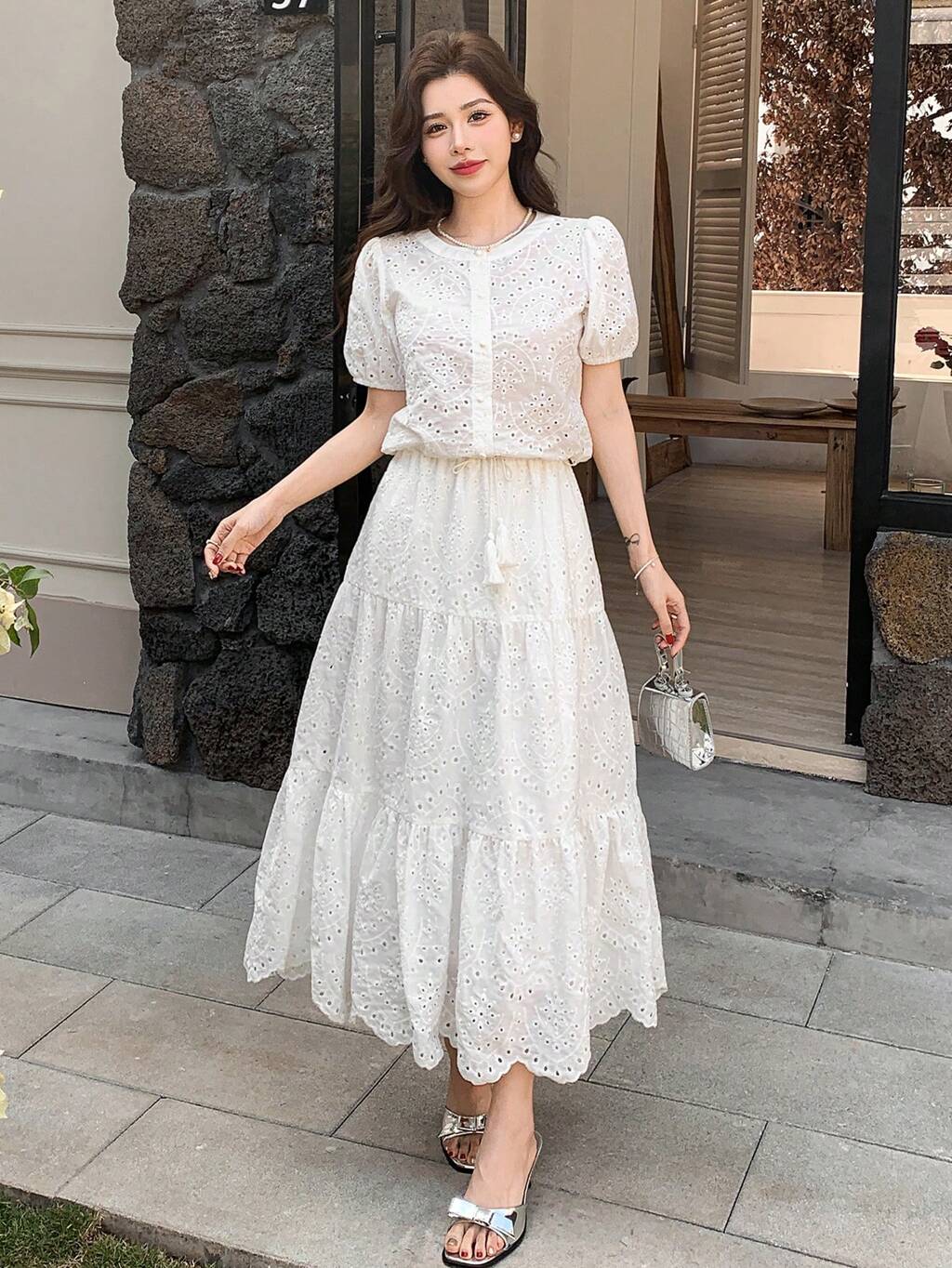Women 2 Pieces Set: Hollow-Out Embroidered Round Neck Puff Sleeve Blouse & Skirt