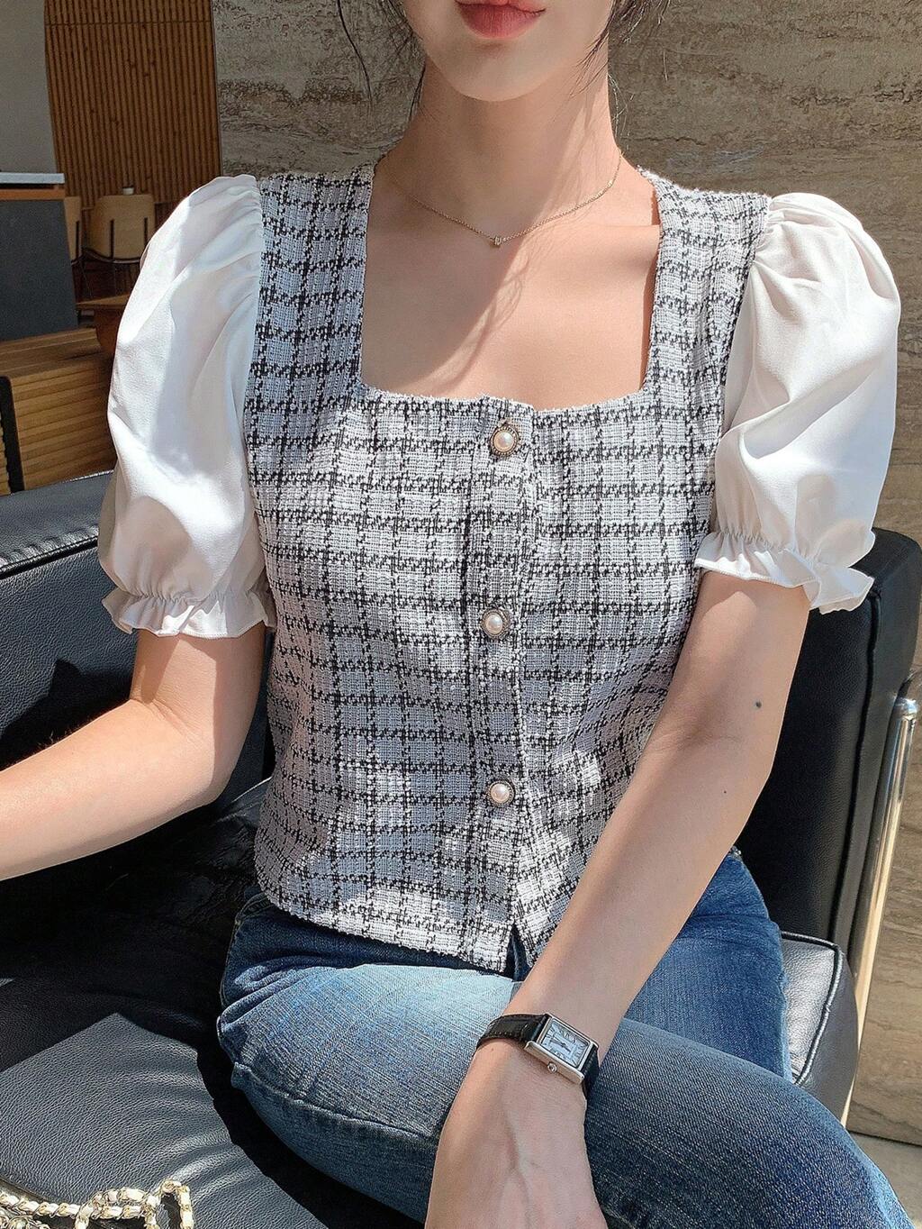 Women's Contrast Color Block Short Sleeve Front Button Simple Casual Shirt Plaid Babydoll Top