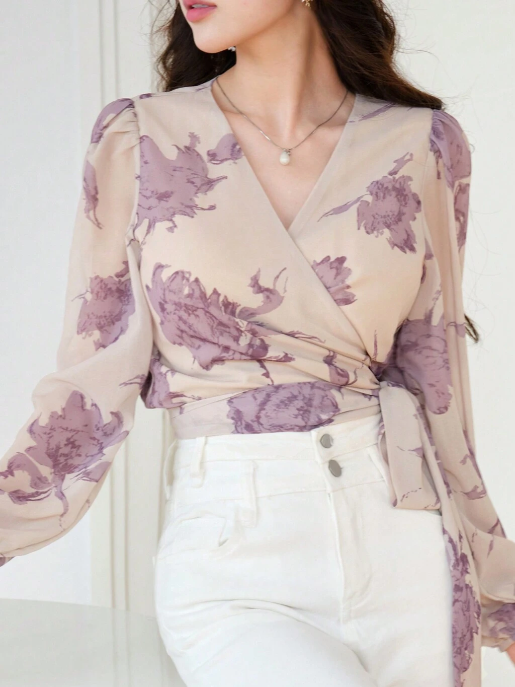 Women's Floral Wrap-Around Long Sleeve Cropped Blouse Vacation Women