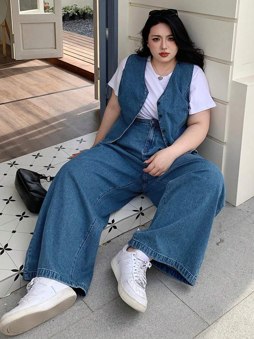 Women's Casual Loose Pocket Shirt And Wide Leg Denim Pants 2 Pieces Set