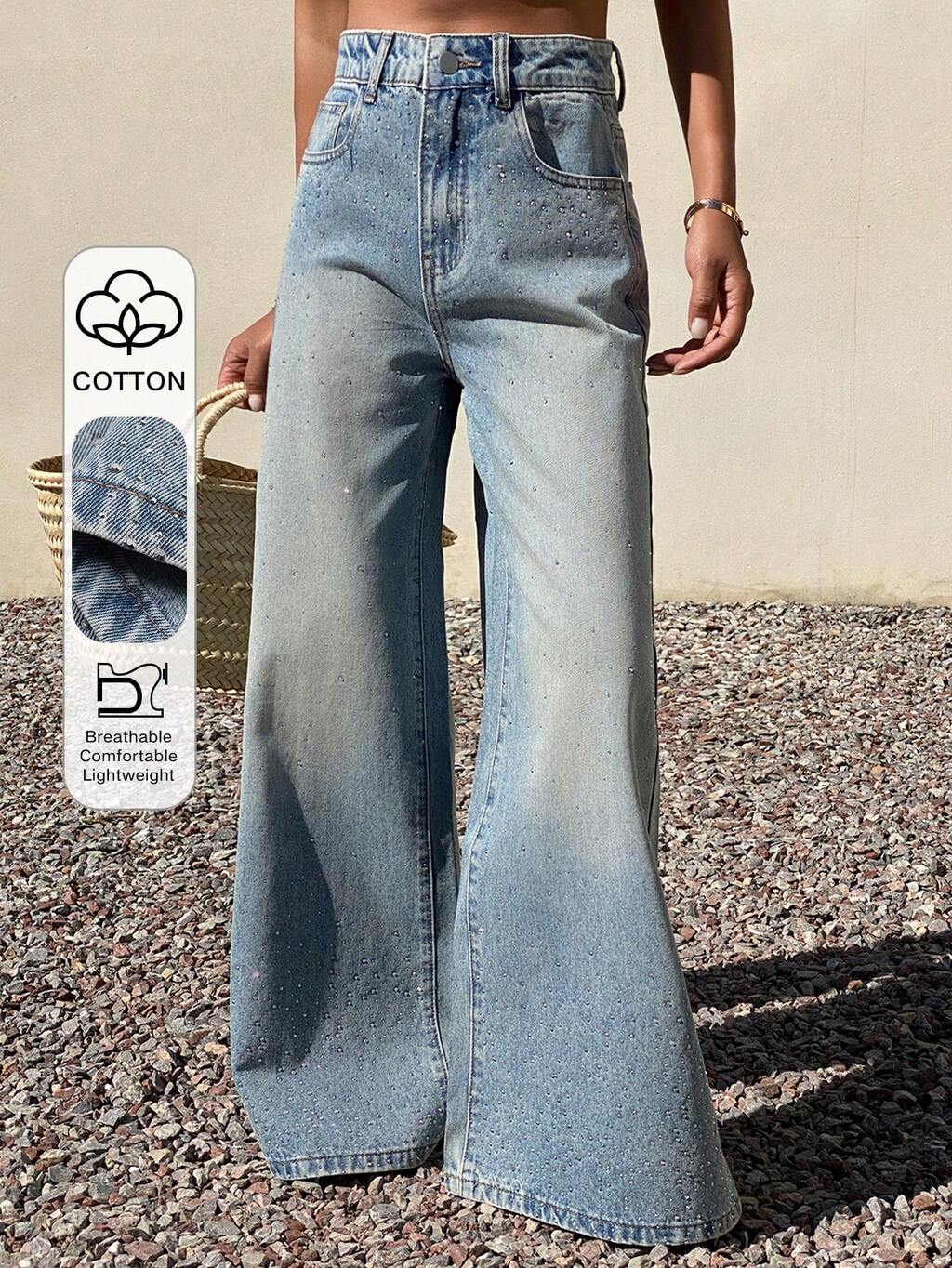 Women's Regular Waist Gradient Rhinestone Design Loose Straight Leg Jeans, Casual And Elegant Y2k