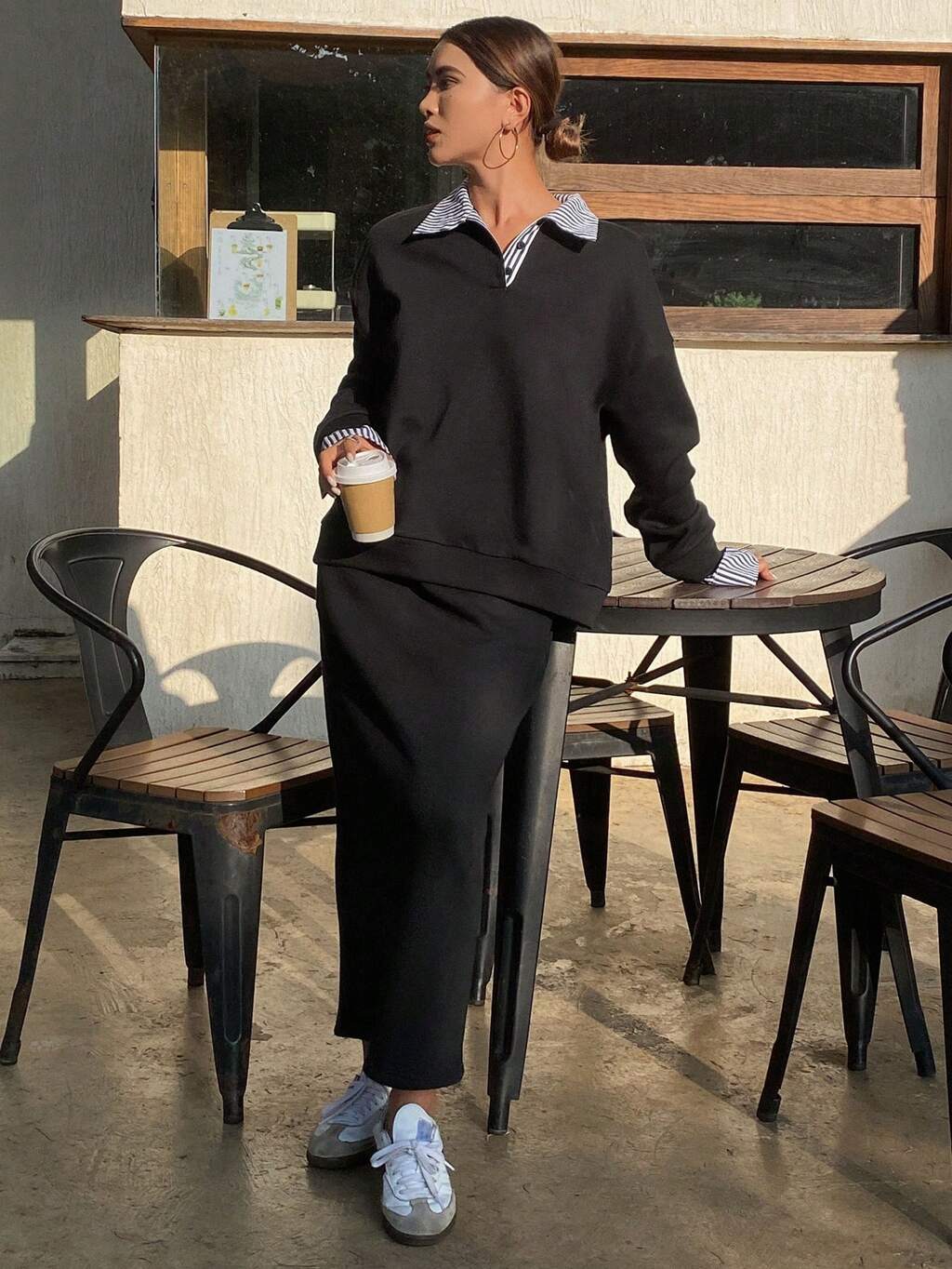 2pcs Set Women Splice Color Block Loose Long Sleeve Sweatshirt And A-Line Skirt,Fall Women Clothes