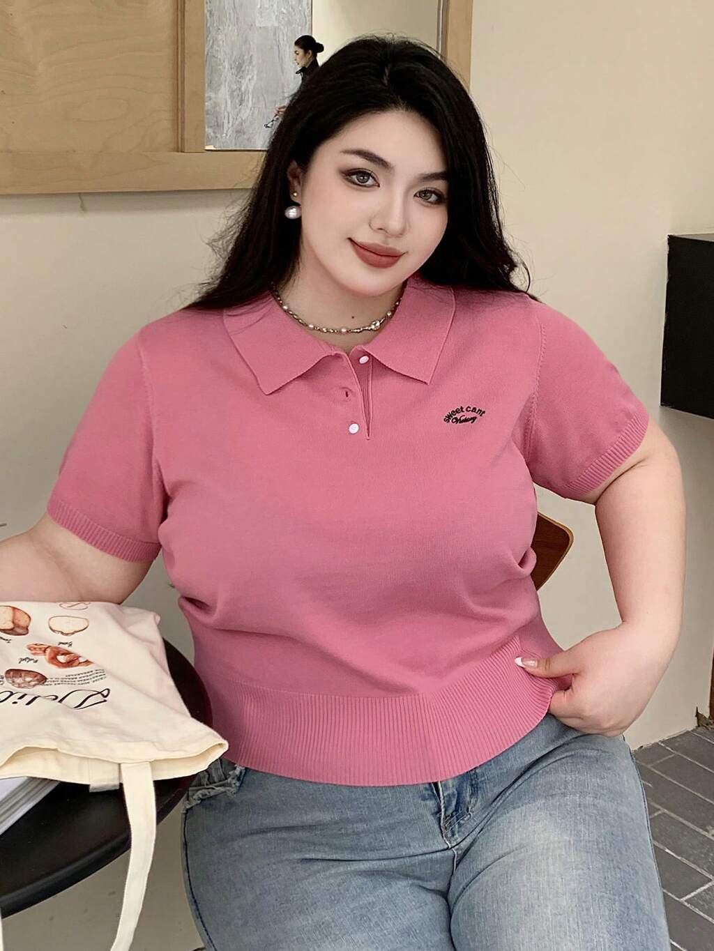 Dazy Plus Valentine Letter Embroidered Polo Collar Half Placket Fitted Knit Sweater Top, Short Sleeve, Spring/Summer